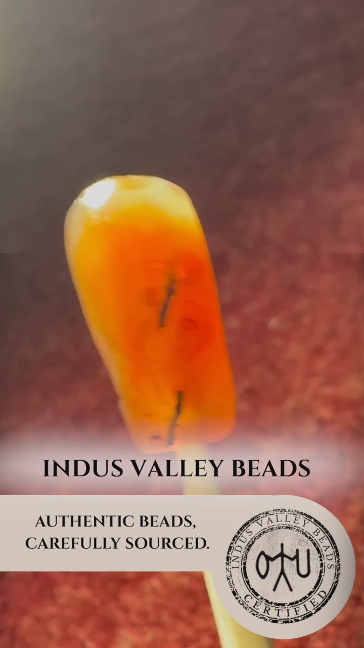 This rare carnelian bead hails from the Gilgit region and dates to approximately 200 AD during the Gandhara period. While it shows gentle wear at the top, the bead features unique eye-like patterns along its sides in a rich dark amber tone, giving it distinctive character. A historic and one-of-a-kind piece, it is well-preserved for its age and comes strung on an adjustable black nylon cord for display or wear.